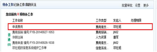 信息录入完之后,点击【转下一步】后弹出下一步审批人选择框,此时申请人选择相关领导审批。点击【确定】,提交费用申请到下一步审批人。申请信息将在流程接收人的工作台上显示,如图