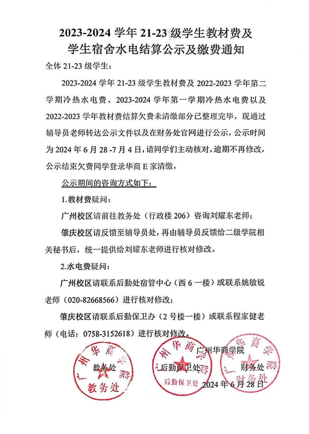 2023-2024学年21-23级学生教材费及学生宿舍水电结算公示及缴费通知