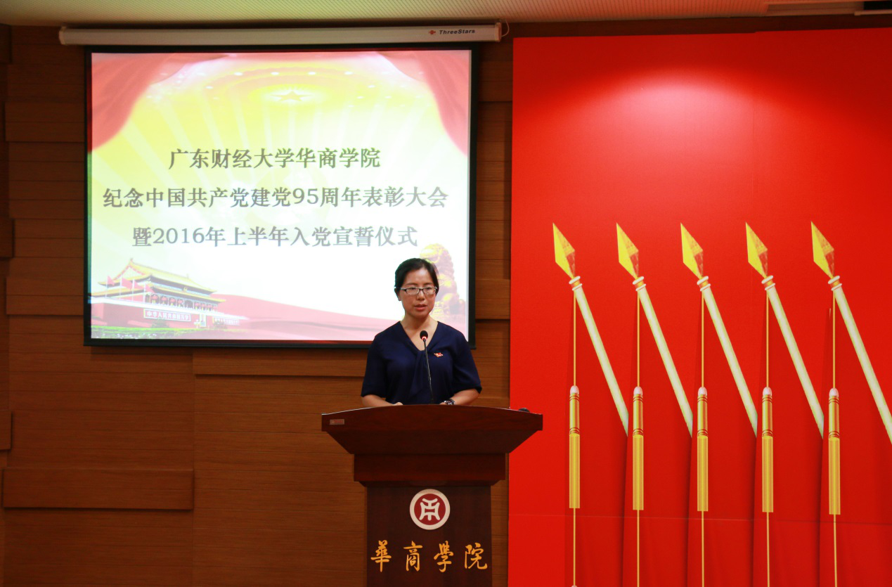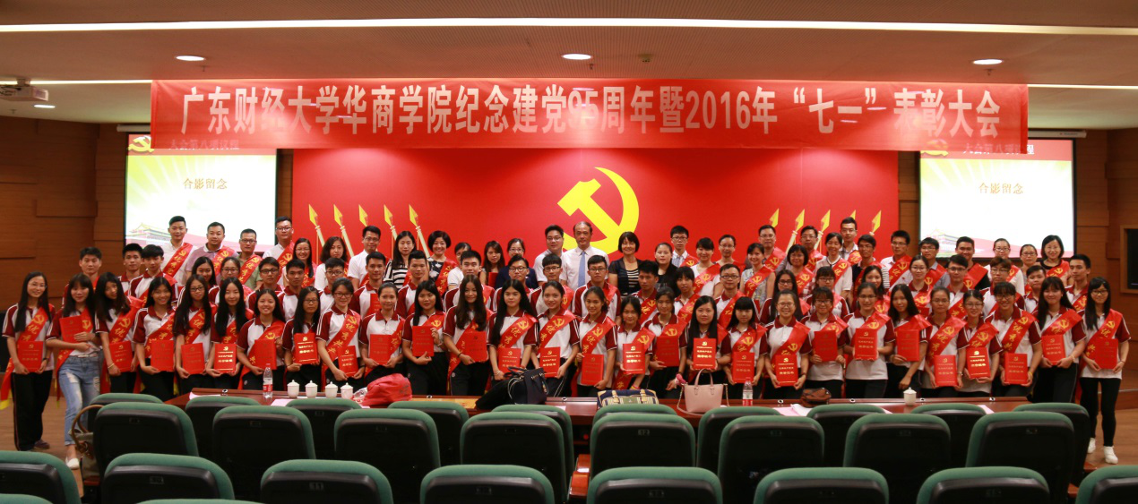 2016年6月20日,广东财经大学华商学院纪念建党95周年暨2016年“七一”表彰大会在图书馆一楼报告厅隆重举行。学院党委书记苏宁,学院党委委员、副院长王锦秀,学院党委委员、学院办公室副主任吕书勉,学院党委委员、学生处副处长黄国富,学院党委委员、会计学院副院长许娜以及学院中层干部、教师党员代表、学生党员代表参加了大会,大会由吕书勉同志主持。