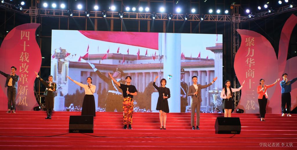 2018年12月26日晚,主题为“四十载改革新风,聚力华商十三载”的校庆晚会于图书馆广场隆重开幕。莅临本次晚会的领导嘉宾有华商教育集团董事、华商常青大学校监陈练瑛女士,广东财经大学华商学院党委苏宁书记,郭银华常务副校长,支戈壁副校长,龙少锋副校长,王锦秀副校长,陈美华副校长,程辛荣副校长,华商教育集团,各处、室以及二级学院、系、部门负责人。