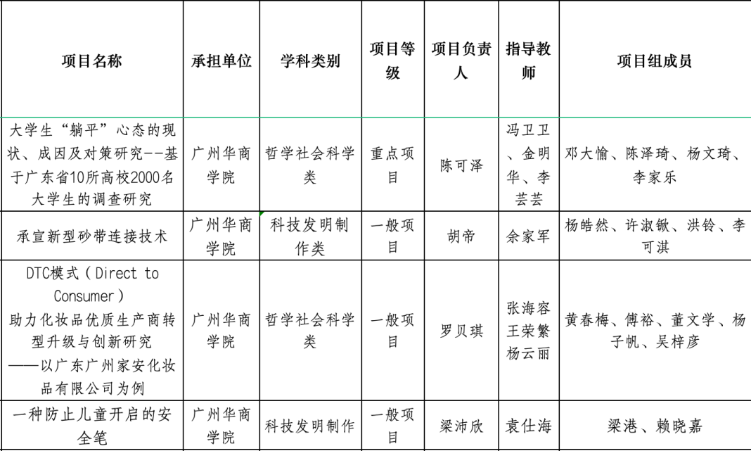 由团省委、省财政厅联合设立的2023年广东省科技创新战略专项资金(大学生“攀登计划”科技创新培育),广州华商学院7个项目获得立项资助,其中重点项目1项、一般项目6项,共获得省财政专项资助12万元。目前,被抽中的四个项均已顺利完成校级中期检查。其中《大学生“躺平”心态的现状、成因及对策研究——基于广东省10所高校2000名大学生的调查研究》也获得第十七届“挑战杯”广东大学生课外学术科技作品竞赛省赛三等奖。《承宣新型砂带连接技术》获第十四届中国大学生服务外包创新创业大赛全国三等奖。