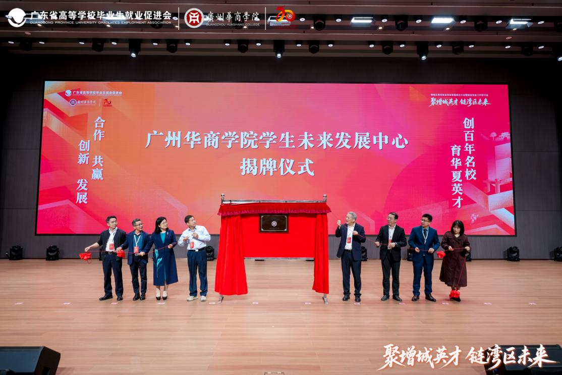 大会期间,省高就会邱克楠会长、向丹阳常务副会长、林伟坚副会长,胡军校长、陈玉欢书记、吕峻闽副校长、余家军副校长、许娜副校长共同为广州华商学院学生未来发展中心揭牌。据悉,广州华商学院学生未来发展中心以服务学生全周期、个性化发展为出发点,将“招培就业一体化”理念融入学生成长全过程,构建覆盖“学业规划-职业赋能-就业支持-创业孵化”四大模块的全周期支持体系,通过提供一对一咨询、名企工作坊、创业项目打磨等精细化服务,提升学生未来发展竞争力。