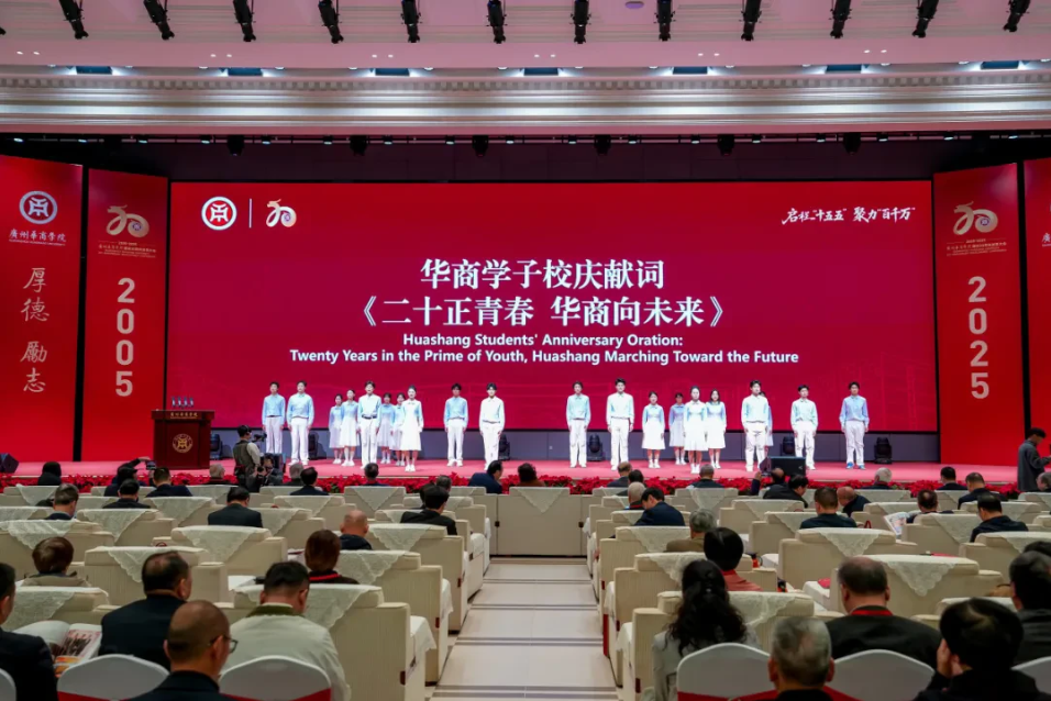 会上,由廖榕就董事长作词创作的校歌《共铸荣光》MV首发。在全体齐唱校歌的激昂旋律中,广州华商学院建校20周年发展大会落下帷幕。